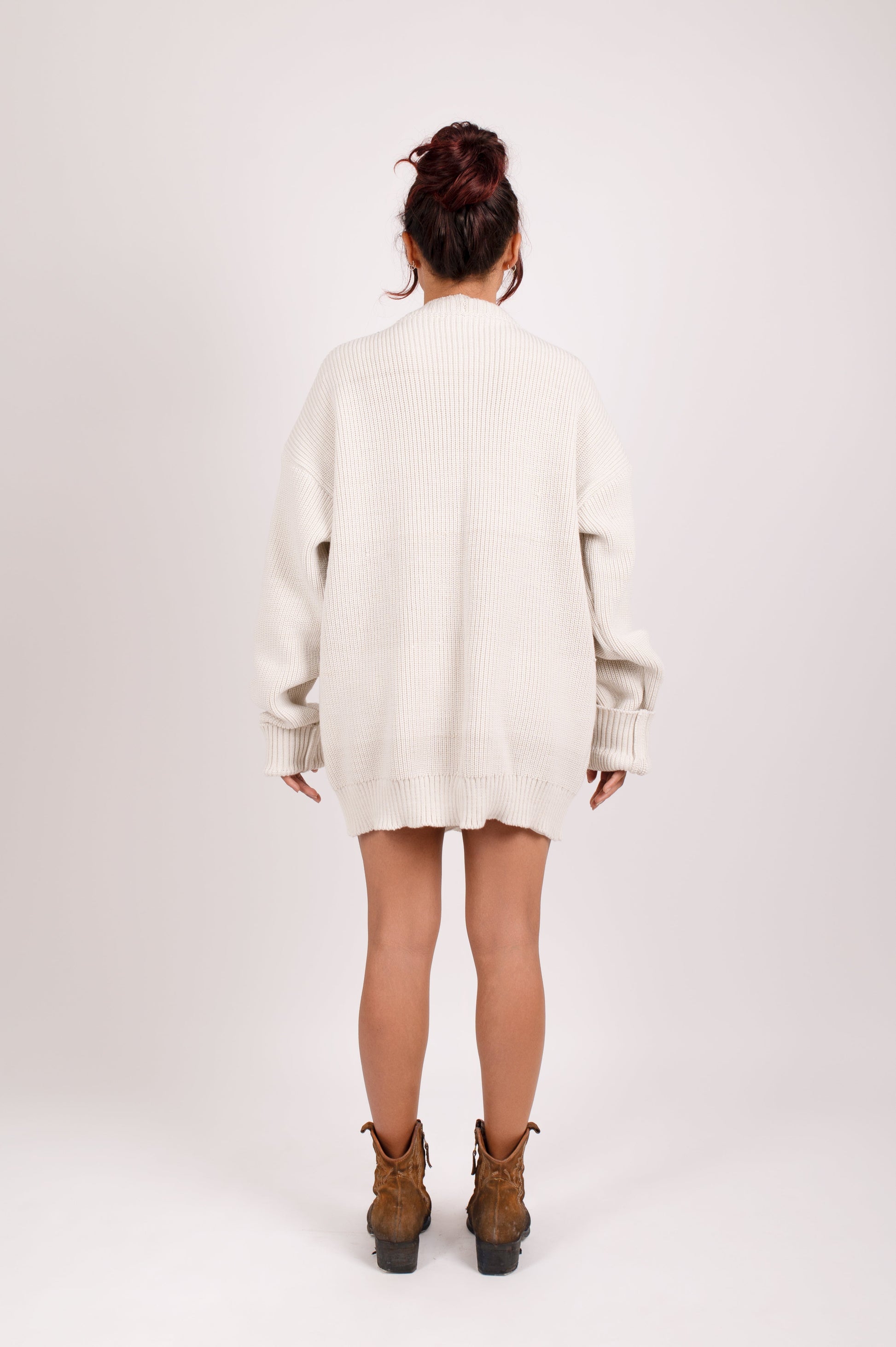 An oversized knee length sweater, with shoulder drop full sleeves and pockets on either sides.