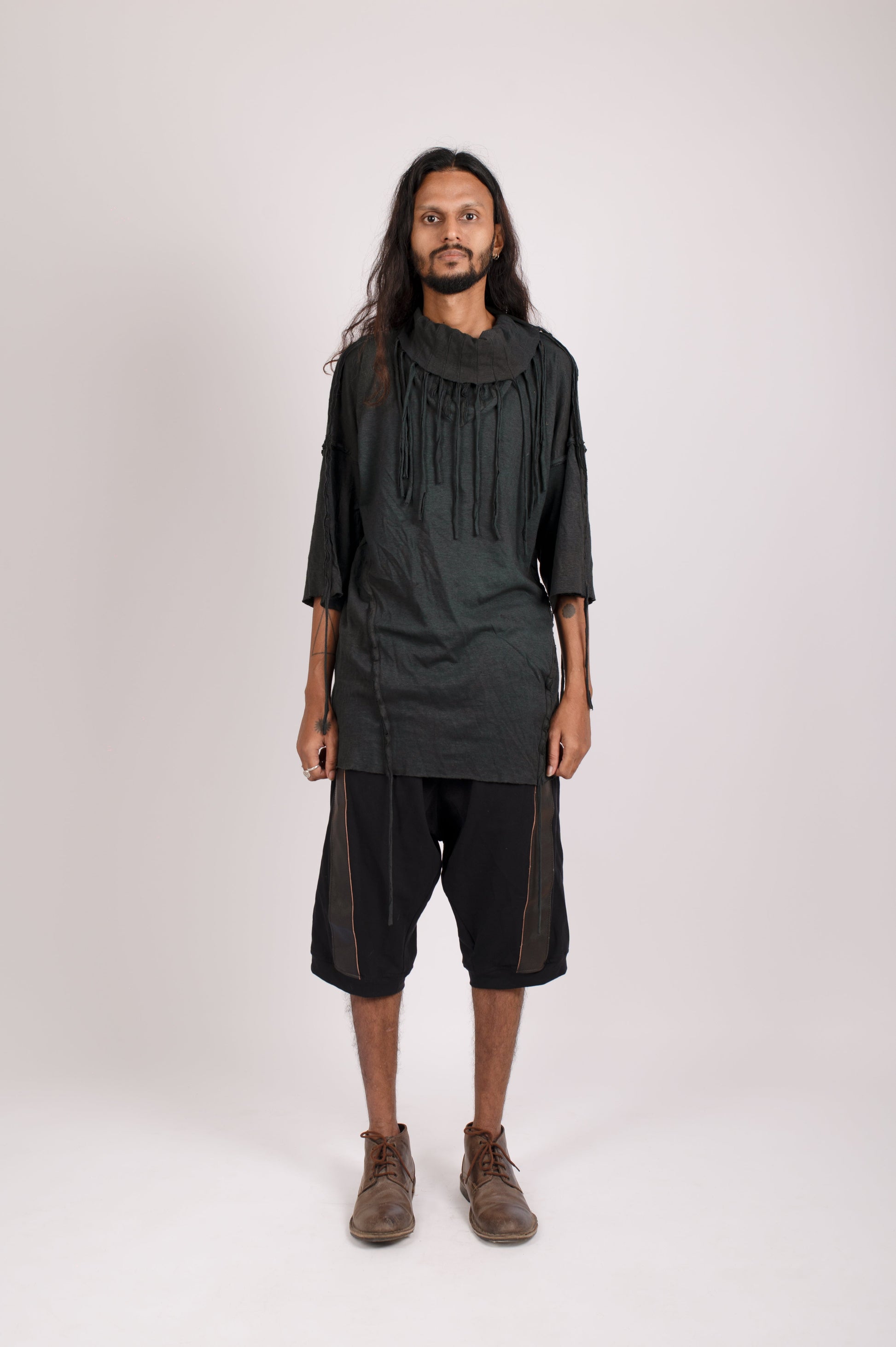 An abstract vest with a high neck, serger sewed and strings over the shoulders.