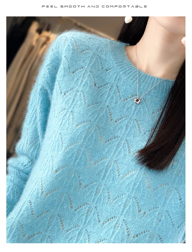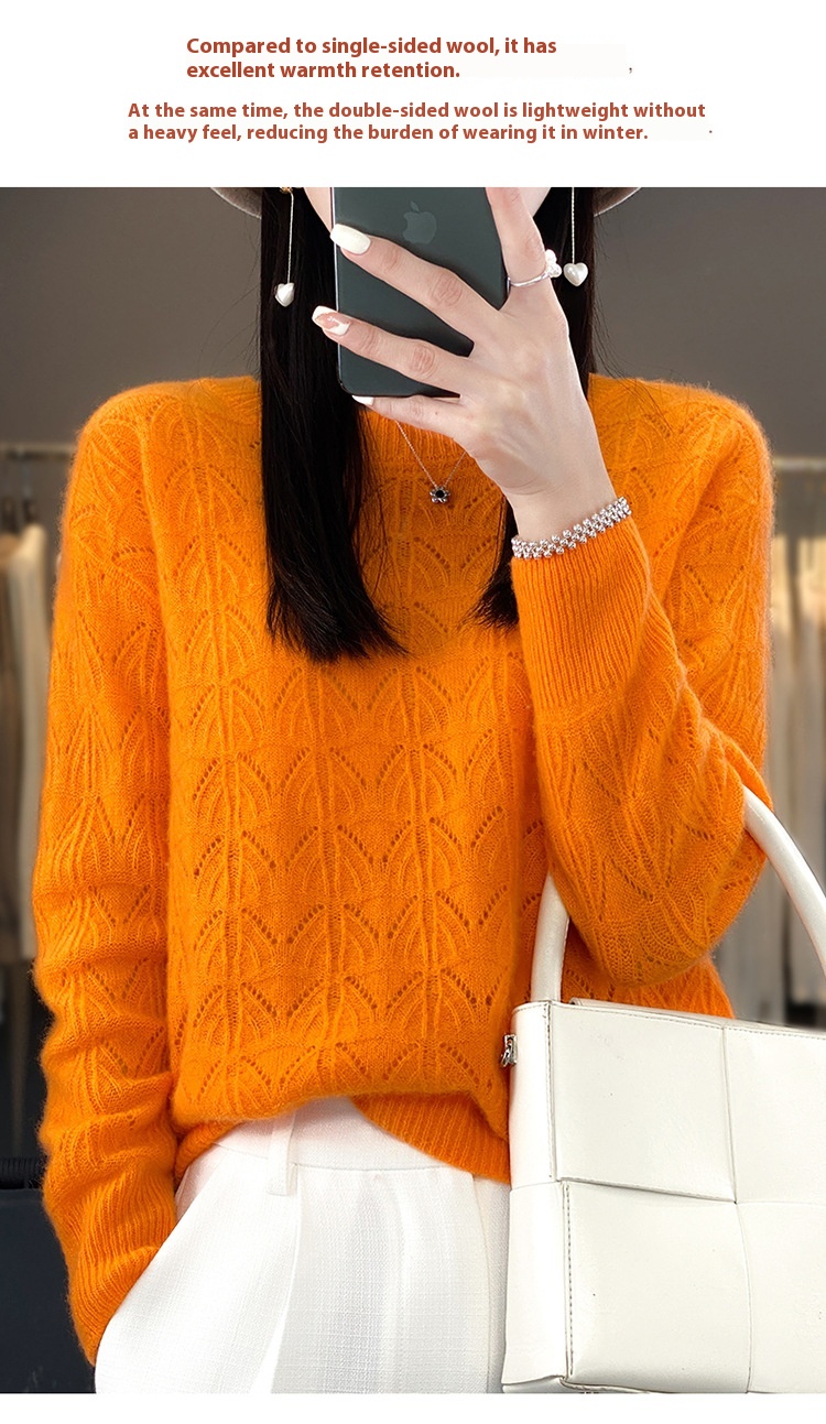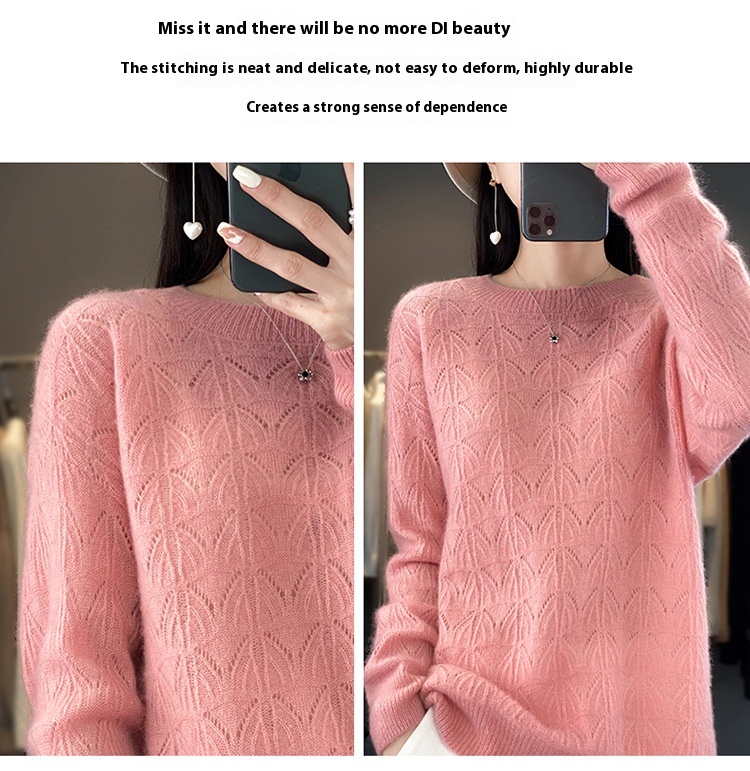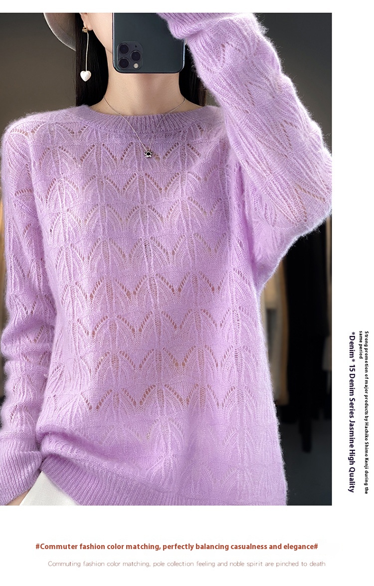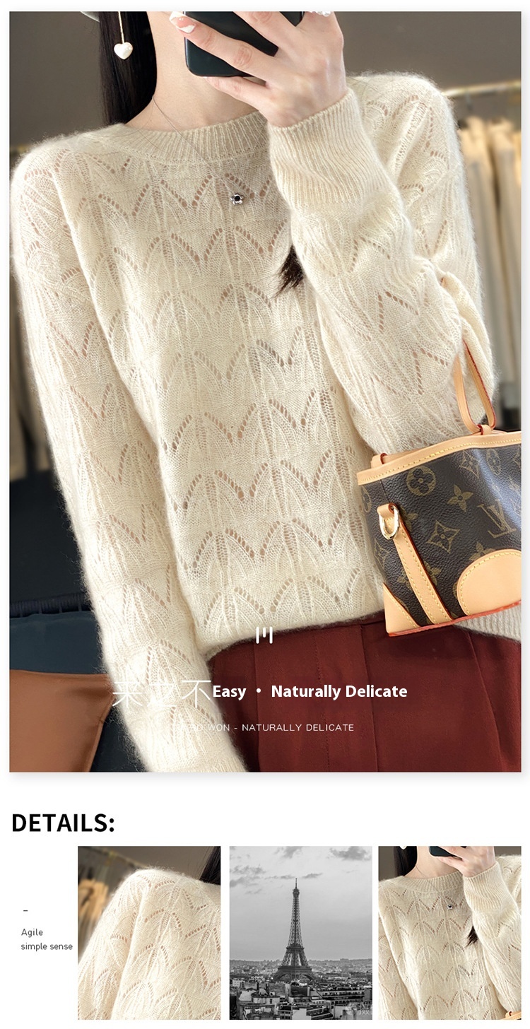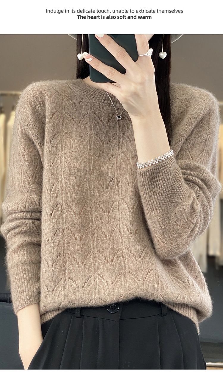 Women's Wool Knitted Round Neck Pullover Hollow-out Solid Color Long Sleeve